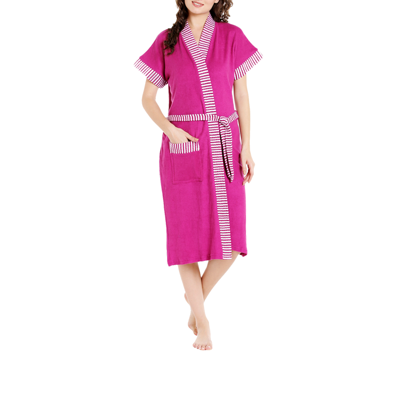 Magenta bathrobe, an open front, short sleeves, belt loops along the waist, a patch pocket