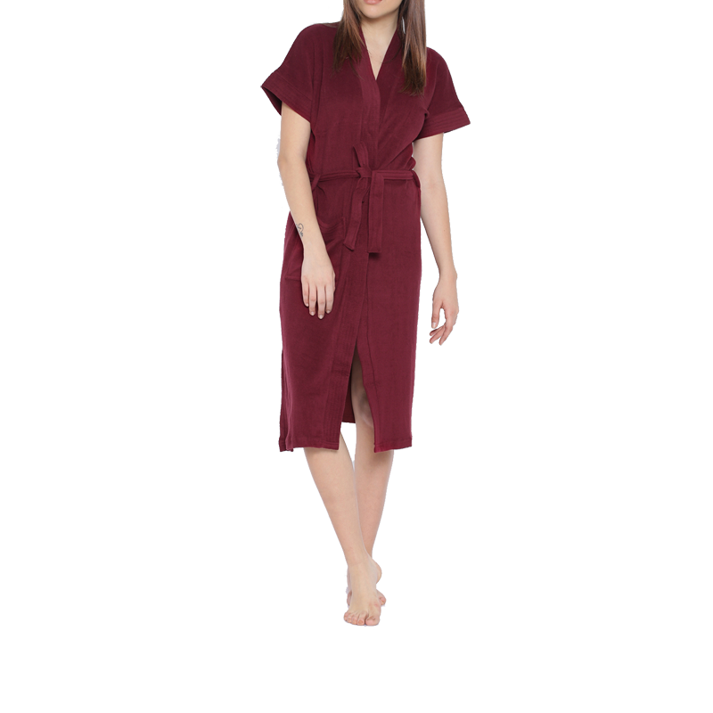 Maroon bathrobe, has an open front, short sleeves, belt loops along the waist, a patch pocket