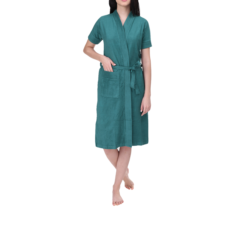 Teal solid bathrobe, has an open front, short sleeves, a patch pocket on the right side, belt loops on the waist