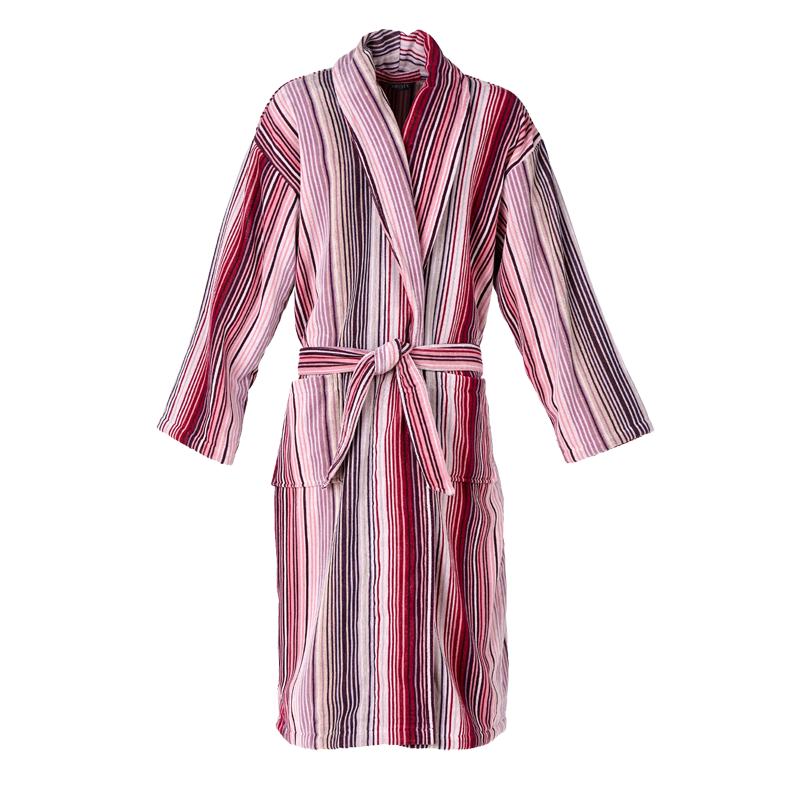 Pink and purple striped bathrobe, has a shawl collar, an open front, long sleeves, two patch pockets, and a belt loop on either side of the waist