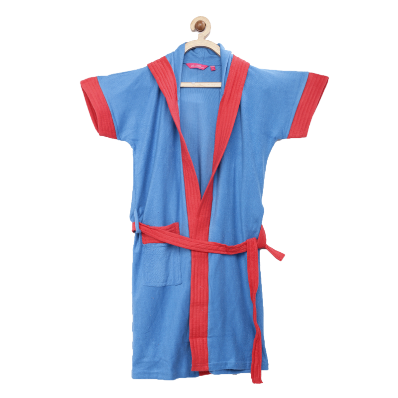 Blue and red bath robe, has a shawl collar, an open front, short sleeves, a patch pocket, belt loops on either side of the waist