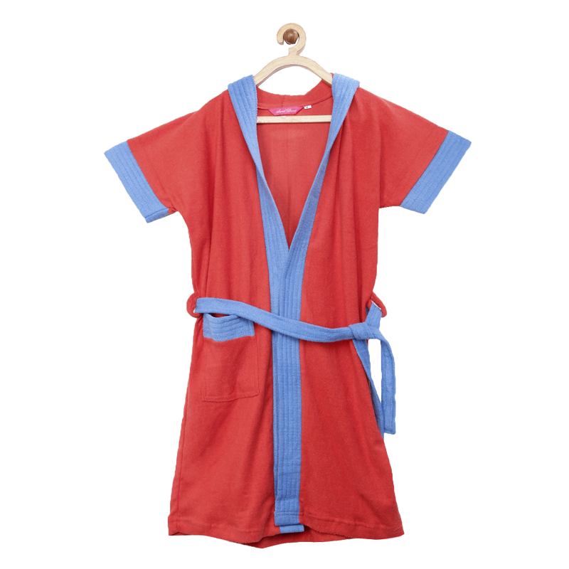 Red and blue bath robe, has a shawl collar, an open front, short sleeves, a patch pocket, belt loops on either side of the waist