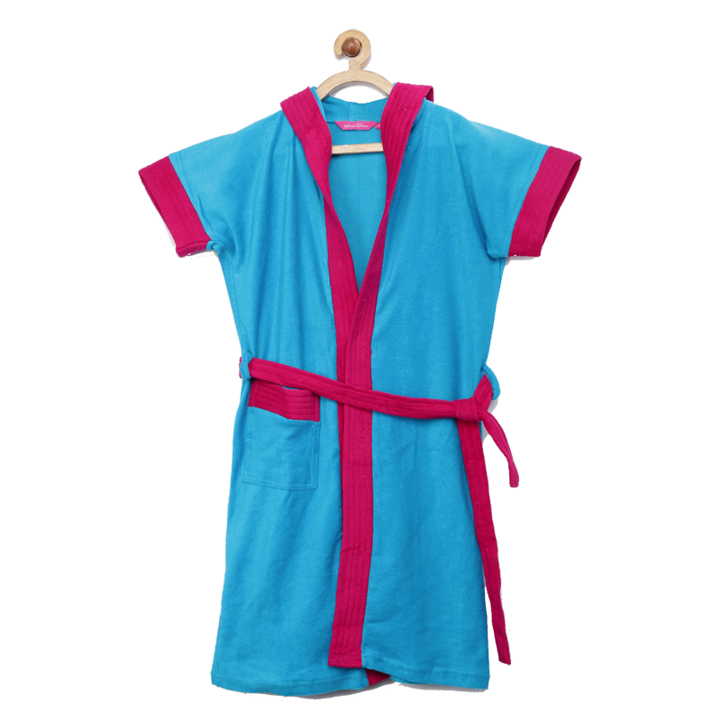 Blue and pink bath robe, has an attached hood, an open front, short sleeves, a patch pocket, and a belt loop on either side of the waist