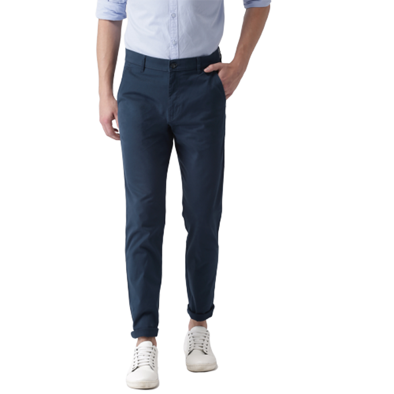 Blue mid-rise chinos, has four pockets, a zip fly with a button closure, a waistband with belt loops