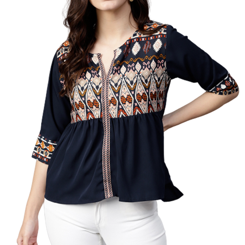 Complete The Look- Give yourself a fashion makeover with this classy three-quarter sleeve top from Pannkh. Pair this navy blue piece with slim jeans and a sling bag for a casual day look.