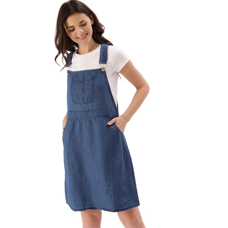 Blue solid woven chambray pinafore dress, has a shoulder straps,,sleeveless, three pockets, straight hem