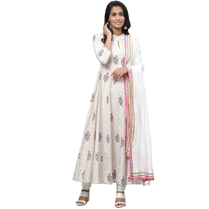 Women White & Golden Printed Kurta with Churidar & Dupatta