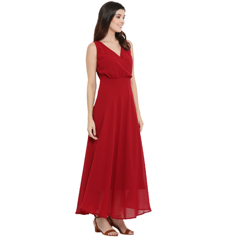 Red solid woven maxi dress,has a V-neck, sleeveless, concealed,zip closure, and flared hem Shape Maxi