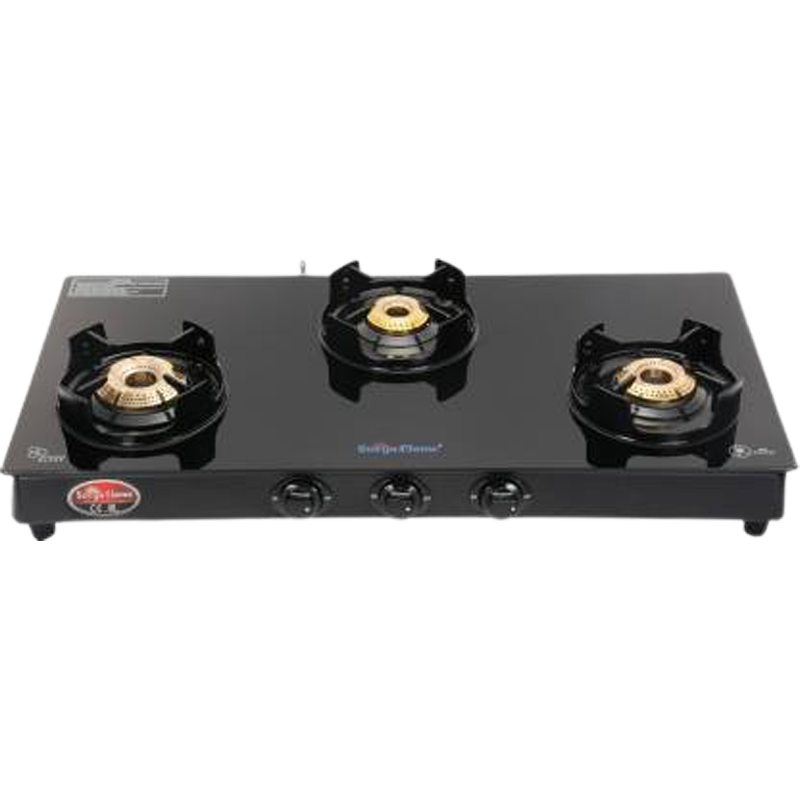 The Suryaflame 3B Black Beauty Glass top Manual Ignition powder coated MS body gas stove comes with high thermal efficient 3 Brass Burner setup for a smart and safe cooking experience.