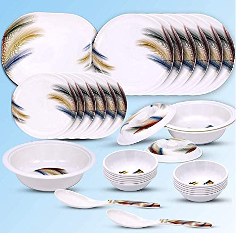 32 PIECE SET- consist of 32 Pieces LIGHT WEIGHT 6 BIG PLATS, 6 SMALL PLATS , 12 SMALL BOWL, 3 BIG BOWL WITH 2 LID, 1 TRAY, 2 BIG SPOON color as par image