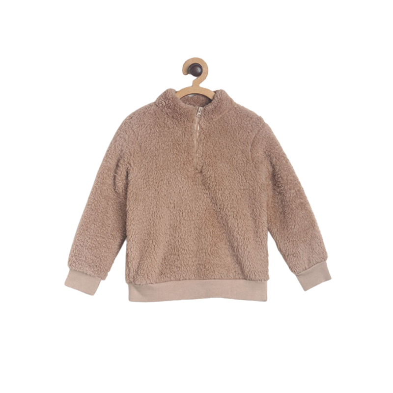 Pink solid sweatshirt has a mock collar, na pockets, long sleeves, closure, straight hem