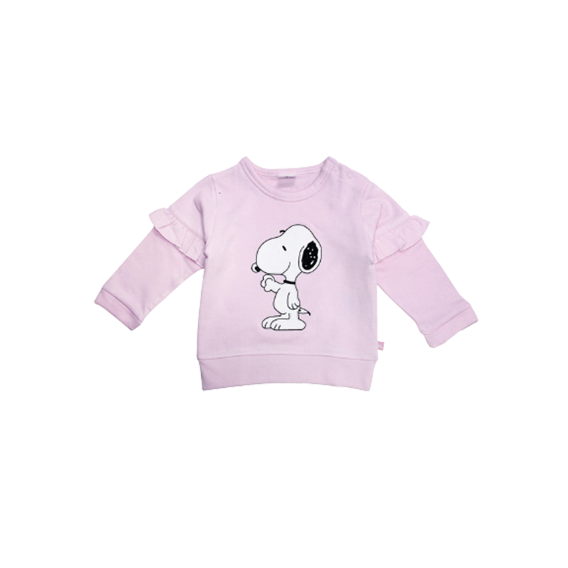 Pink and white snoopy print sweatshirt, has a round neck, long sleeves with ruffle detail, closure, straight hem