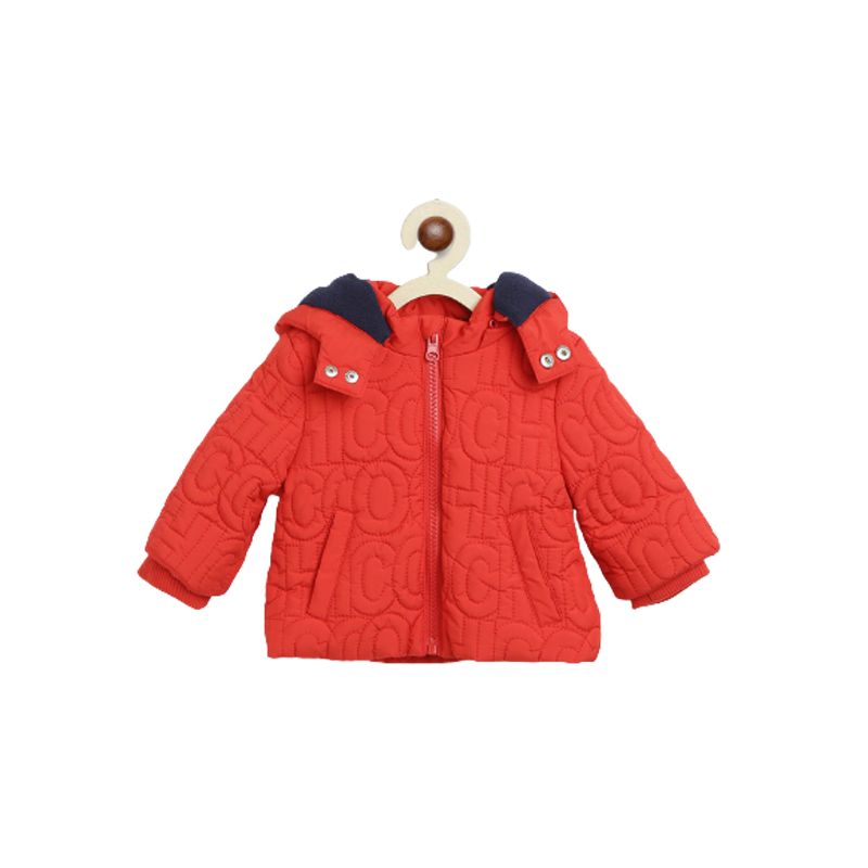 Red typography self design padded jacket with faux fur trim, has a hooded, 2 pockets ,has a zip closure, long sleeves, straight hemline, polyester lining