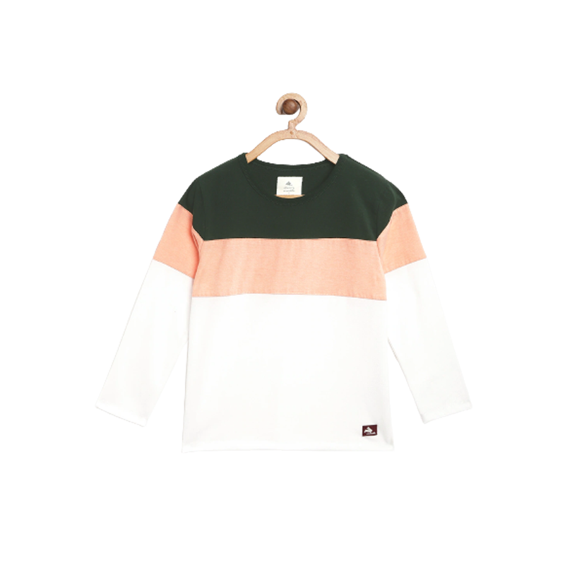 White, peach-coloured and green colourblocked T-shirt, has a round neck, and long sleeves
