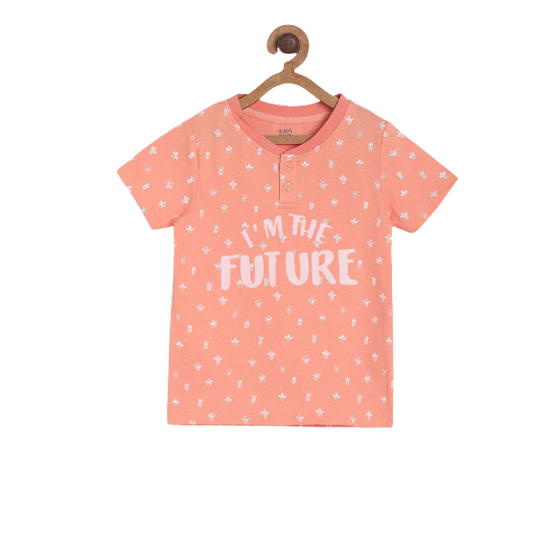 Mini Klub Boys Peach White Printed Mandarin Collar Cotton Pure Cotton T-Shirt