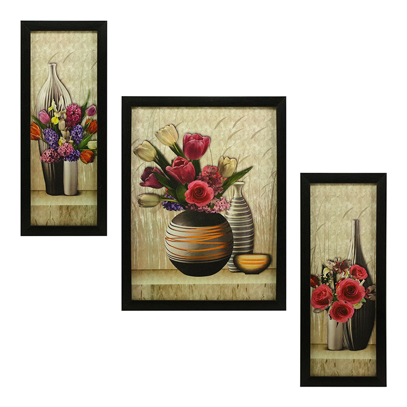 Indianara 3 Pc Set Of Floral Paintings (1056) Without Glass 5.2 X 12.5, 9.5 X 12.5, 5.2 X 12.5 Inch