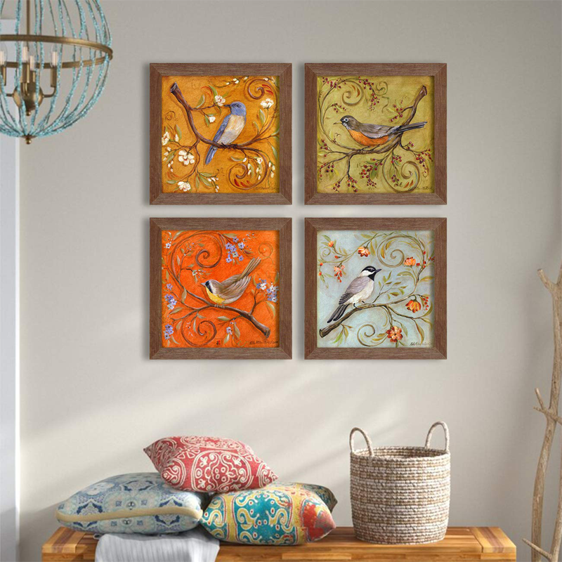 Painting Mantra - Multicolor Jardine Birds Set Of 4 Brown Framed Painting,Uv Textured Art Prints (10 X 10 Inch)