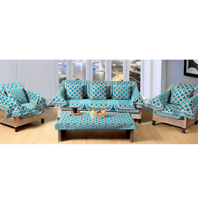 Multitex Eye-Catching Velvet Abstract Designer 5 Seater Sofa With Table Cover Set For Living Room, 18 Pieces (Standard, Ferozi Blue)