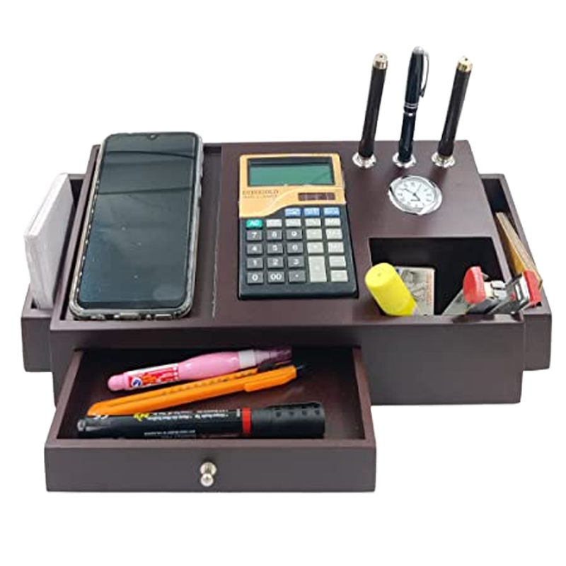 All In One Multi Storage Wooden Desk Organizer For Office Table, Wooden Pen Stand For Office Table With Clock, Calculator, Mobile Holder For Office Table & Student Study Table, Office Stand