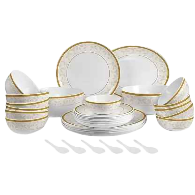 Specifications Sales Package - 6-Pieces Full Plate, 6-Pieces Quarter Plate, 6-Pieces Veg Bowl, 2-Pieces Medium Serving Bowl, 1-Piece Oval Platter, 6-Pieces Soup Bowl and 6-Pieces Spoon Model Number - DIVINE Design - Royale Convenience Features - Freezer Safe, Dishwasher Safe, Microwave Safe Other Features - Tuff German glass technology, Break & chip resistant, Extra strong, Thermal Resistance 0 degree > 90 degree, Scratch resistant, Light Weight, Easy to Clean, Smooth Surface, Super White, Food Grade – 100 percent Hygienic, 100 percent Vegetarian - Bone Ash Free, Recyclable Weight - 7.8 kg Diameter - Dinner Plate - 11 inch, Quarter Plate - 7.5 inch, Veg Bowl - 3.7 inch, Serving Bowl - 7 inch, Oval Platter - 13 x 10 inch, Soup Bowl - 4.4 inch