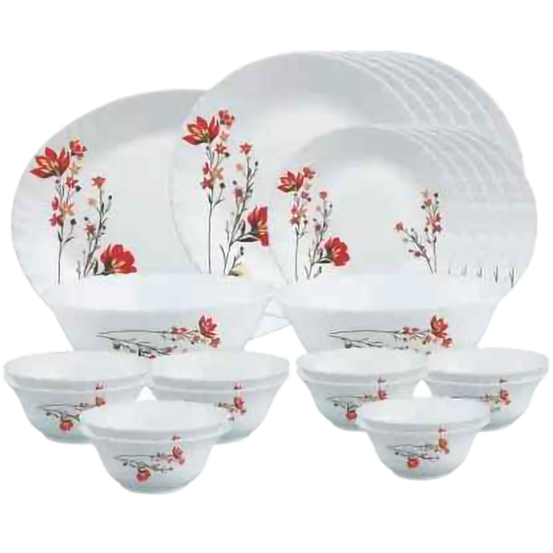 Specifications Sales Package Package Contents - 6-Piece 11" Full Plates, 6-Piece 7" Quarter Plates, 1-Piece 13" Rice Plate, 2-Piece 8" Serving Bowls, 6-Piece 5" Soup Bowls, 6-Piece 4.5" Veg Bowls Model Number - CHRYS RED Finish - Glossy Design - Floral Convenience Features - Dishwasher Safe, Freezer Safe, Microwave Safe, Stain Resistant Other Features - vegetarian as it is completely bone ash free, unlike bone china, food safe and will not leech any chemicals into your food, Does not absorb stains or odors, Extremely hygienic and easy to clean Diameter - Plates 11 inch, Quarter plates 7 inch, Rice Plate 13 inch, Serving Bowls 8 inch, Soup Bowls 5 inch, Veg Bowls 4.5 inch