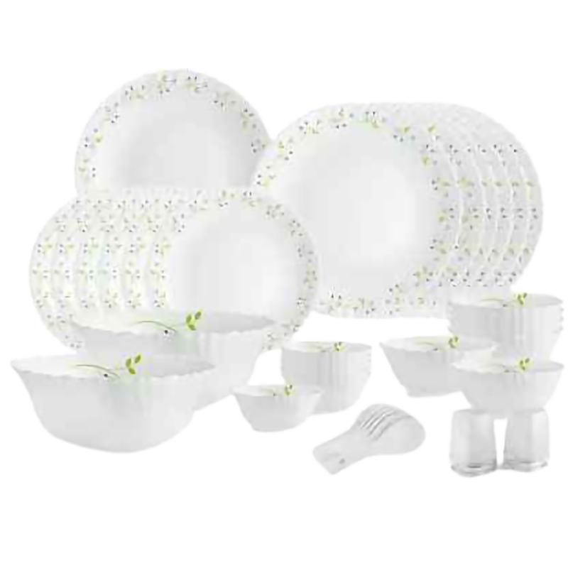 Specifications Sales Package - 6-Pieces Full Plate(10 inch), 6-Pieces Quarter Plate(7 inch), 6-Pieces Veg Bowl (150ml- 4 inch), 6-Pieces Soup Bowl(6 inch), 2-Pieces Serving Bowl(7 inch), 1-Piece Round Platter(11 inch), 2-Pieces Salt and Pepper Shaker, 6-Pieces Spoon Model Number - 8901372122043 Design - Tropical Lagoon Diameter - Plate - 11 inch