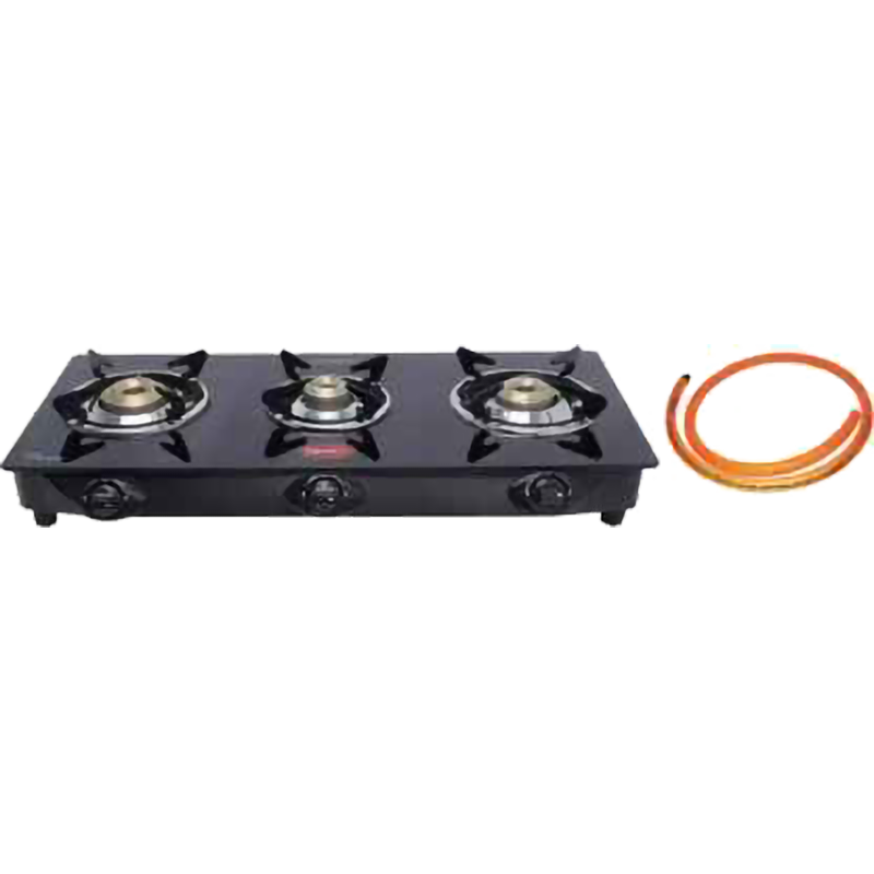 General Brand - Pigeon Model Name - Brunet 3 Burner Glass Cooktop with hose pipe Model Number - 15243 Body Material - Stainless Steel, Glass Trivet Material - Steel Burner Material - Brass Color - Black Shape - Rectangle